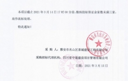 本項目截止2021年2月18日17時00分前,繳納投標(biāo)保證金家數(shù)未滿三家,故作流標(biāo)處理。特此通知!采購人:雅安市名山區(qū)茶城建設(shè)工程有限公司采購招標(biāo)代理機構(gòu):四川省中遂建設(shè)項目管理有限公司日期:2021年2月20日...