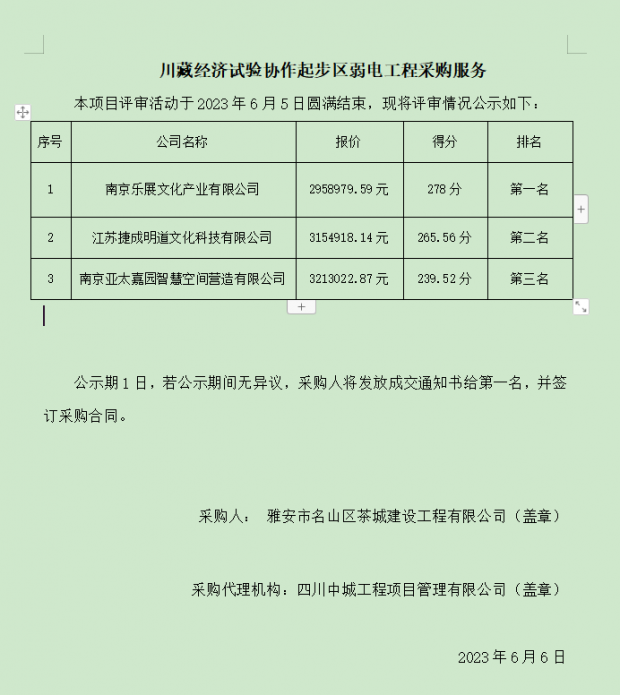雅安市名山區天蒙路片區鄉村振興產業融合發展示范帶建設項目(一標段)設計施工總承包+運營標段勞務+機械采購項目招標結果公告...